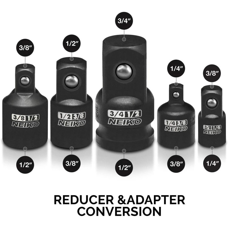 • DRIVE BIT ADAPTER: 5 Piece set includes 2 reducers in 3/8” female to 1/4” male and 1/2” to 3/8”, also includes 3 adapters in 1/4" Female to 3/8” Male, 3/8” to 1/2”, and 1/2" to 3/4 Inch to convert all your impacts to different size sockets.