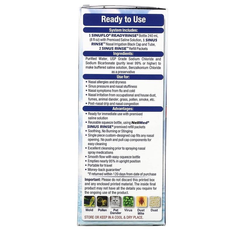 NeilMed SinuFlo Ready Rinse is a premixed solution that lets you enjoy a natural, soothing saline nasal wash anywhere in the world, without having to measure ingredients or findpurified water. The easy-squeeze bottle system allows you to deliver saline solution with sufficient pressure to clean your nasal passages thoroughly, while maintaining your head in a comfortable position. By washing away excess mucus—as well as allergens, bacteria and environmental pollutants—nasal irrigation can reduce inflammation and relieve congestion, runny nose and post-nasal drip. It has also been found to reduce infection and decrease the need for sinus medications. SinuFlo Ready Rinse is excellent for all ages.