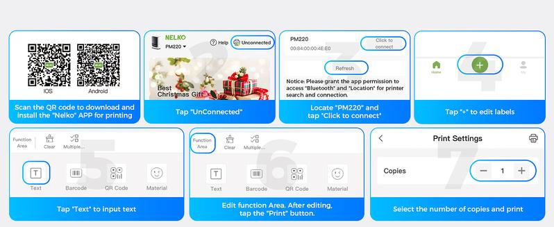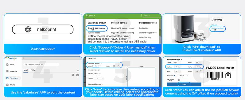 - 【Easy to Use】PM220 Bluetooth Label Maker supports iOS & Android and PC. For iOS & Android mobile phone, please download the "Nelko" APP to Print via Bluethooth. For PC, you need to download the driver and APP, please visit " nelkoprint.com" to obtain the PM220 computer driver and APP. Notice: Please DO NOT connect directly via Bluetooth for all devices. Notice: Click "Connection" in the mobile app's upper right corner-Setting-Beep can turn off the prompt sound.