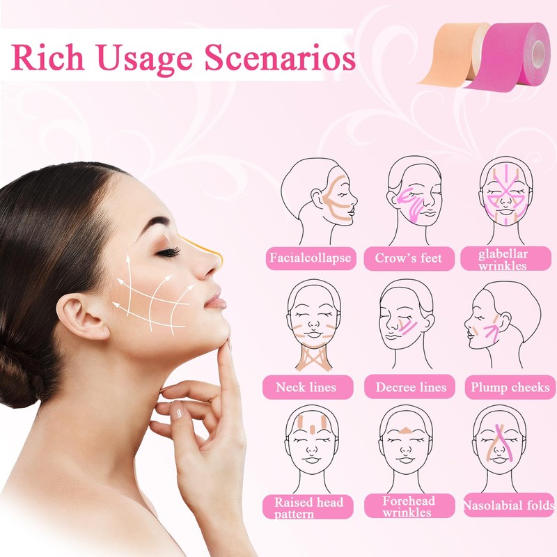 - Versatile applications: this kinesiotapes face adheres seamlessly to your face and helps you train your facial muscles, then experience a youthful lift to create smoother, firmer skin. Whether combating muscle sagging on the face, double chin, forehead lines, forehead lines, forehead lines, lower eyelid lines, eye corners, nose wrinkles, mouth angles or neck wrinkles, significant improvements are achievable.