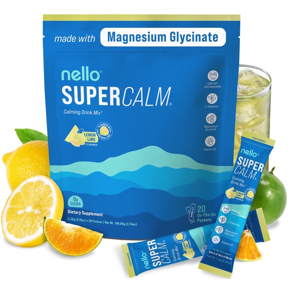 Nello Supercalm Powdered Drink Mix, Cortisol Reducer* and Sleep Aid Supplement, L Theanine, Ksm-66 Ashwagandha, Magnesium Glycinate, Vitamin D 3, No Sugar, Non GMO, On The Go, 20 Ct, Lemon Lime