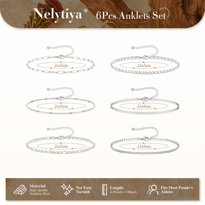 - Anklets for Women: You can get six different styles of anklets in one order, including snake anklet,figaro anklet, paperclip anklet,chain anklets and 2 other different styles let you choose. You can wear them individually or stacked. These 6 pieces fashion women's anklets are perfect for elegant fashion foot jewellery