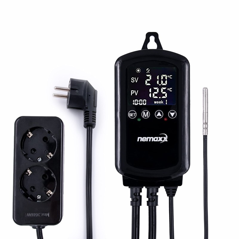 Nemaxx NTP16 - digital, programmable 230 V temperature controller with temperature sensor and 2 sockets for ideal temperature control of both heaters and cooling devices up to 3000 W/16 A.