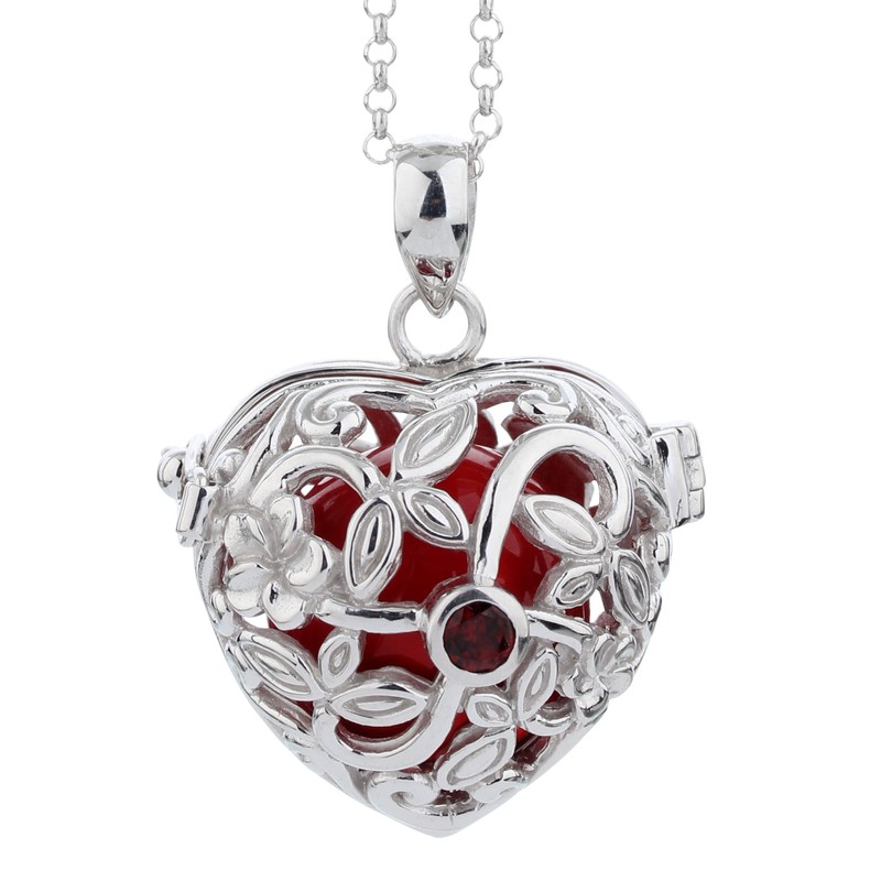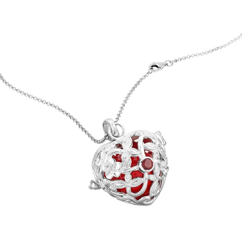 Nenalina Silver necklace with angel whisperer heart pendant and red chime ball, women's necklace with jewellery and chain pendant, length 80 cm, 925 sterling silver, EFS-007, Sterling Silver, Garnet