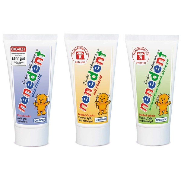- Nenedent Children's toothpaste in a practical set of 3. With all three varieties to try.