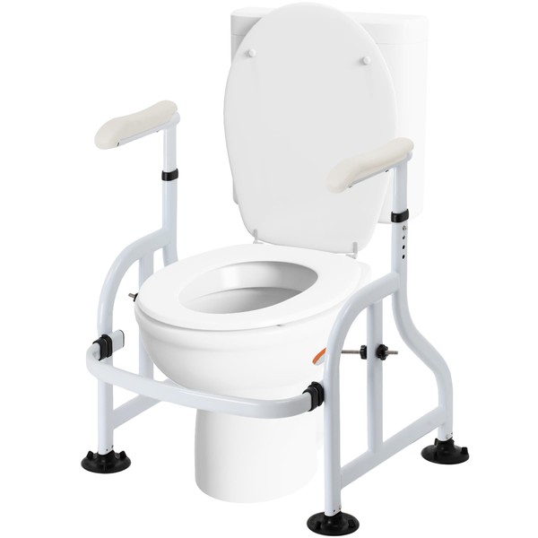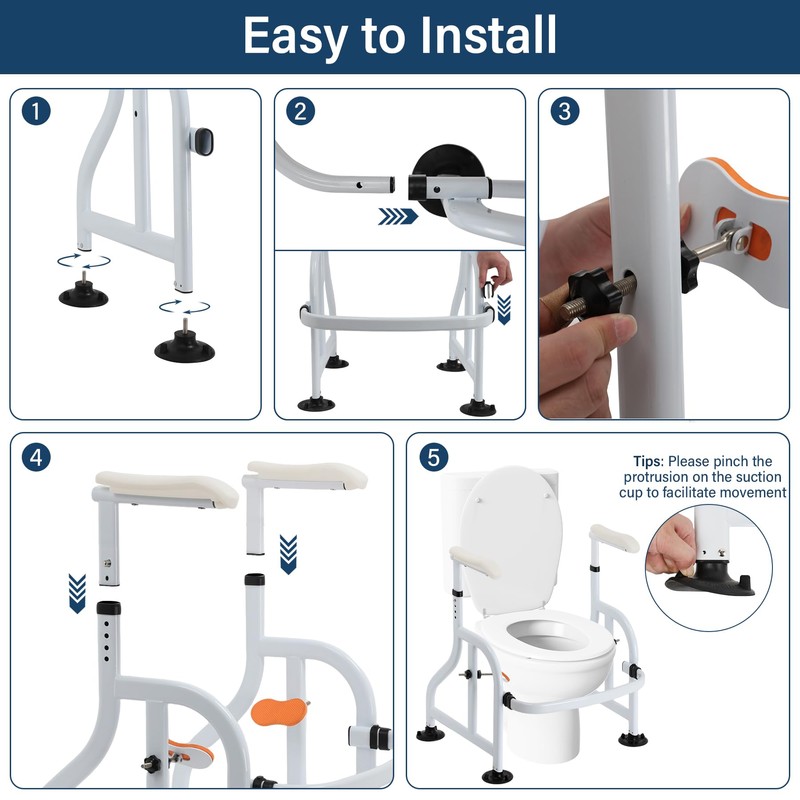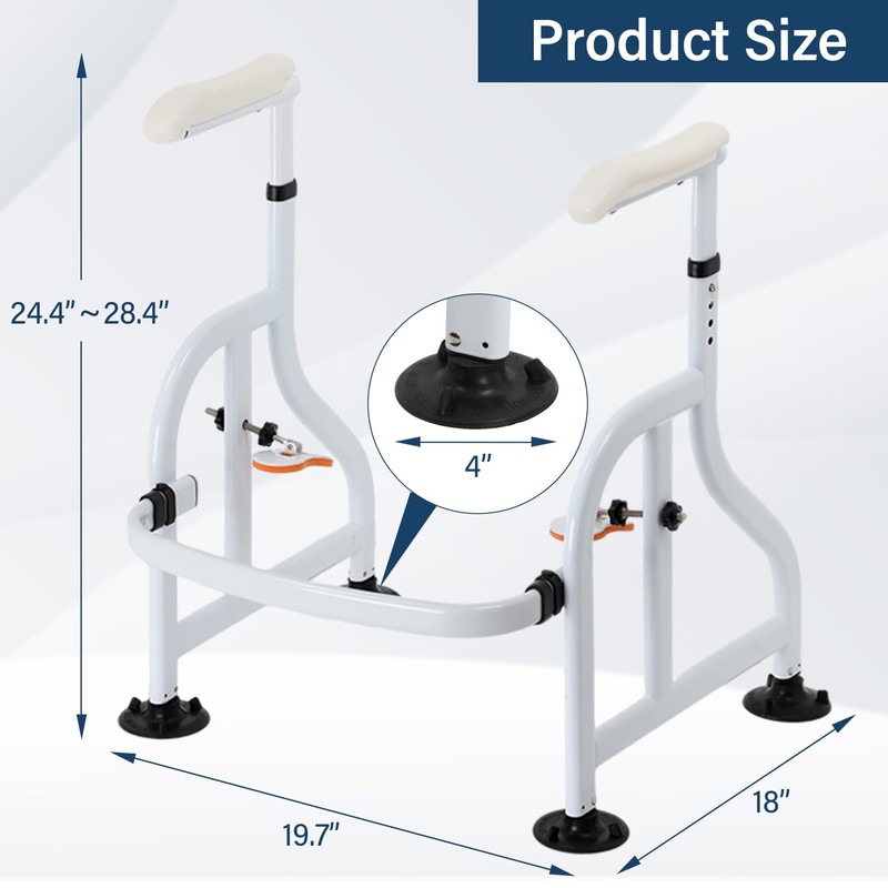 - Considerate Design: 4 suction cup feet firmly lock the toilet safety frames & rails to the ground and protect the floor; 2 support rods with protection pads fix the support frame and the toilet; Bring strong stability and no worry about shaking