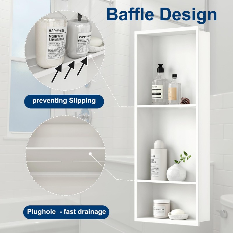 Neodrain 12X30 Inch White Three Layers Stainless Steel Shower Niche, NO Tile Needed Recessed Niche Shelf for Bathroom Storage, 3-Tier Recessed Built-in Wall Niche
