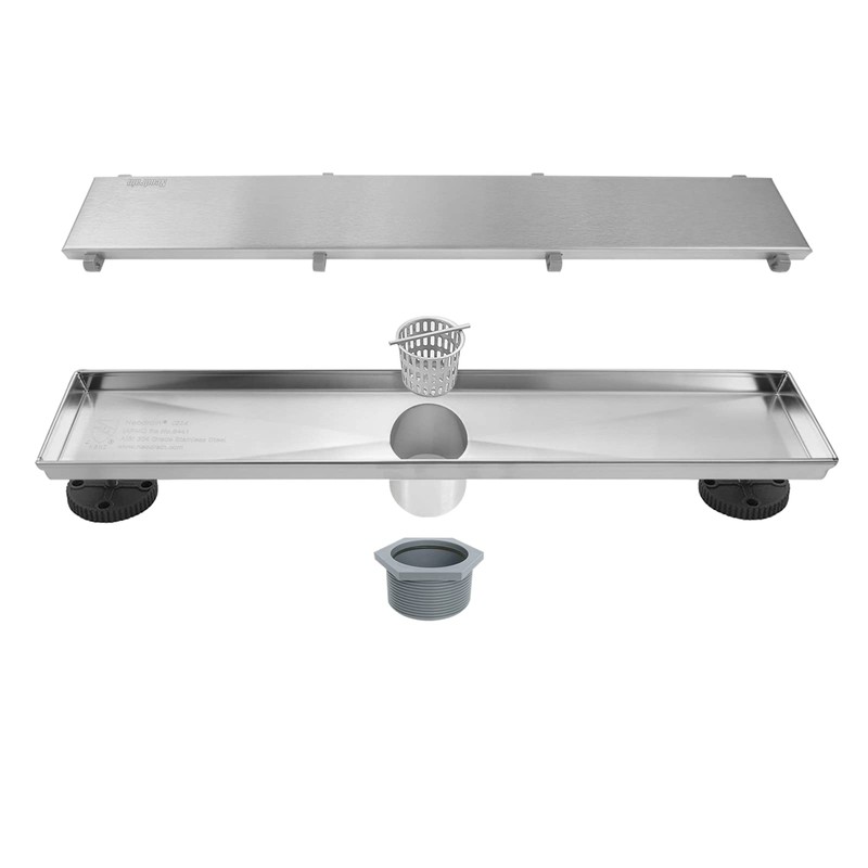 - 【Linear Shower Drain Accessories】 Open the Grate from both sides of the linear shower drain by using a lifting hook, the strainer can filter hair and particulate impurities effectively. Adjustable feet support the channel body during installation,can solve the installation problem effectively caused by the unevenness of the ground. Threaded Adapter joints with rubber ring to adjust the height of the drain.