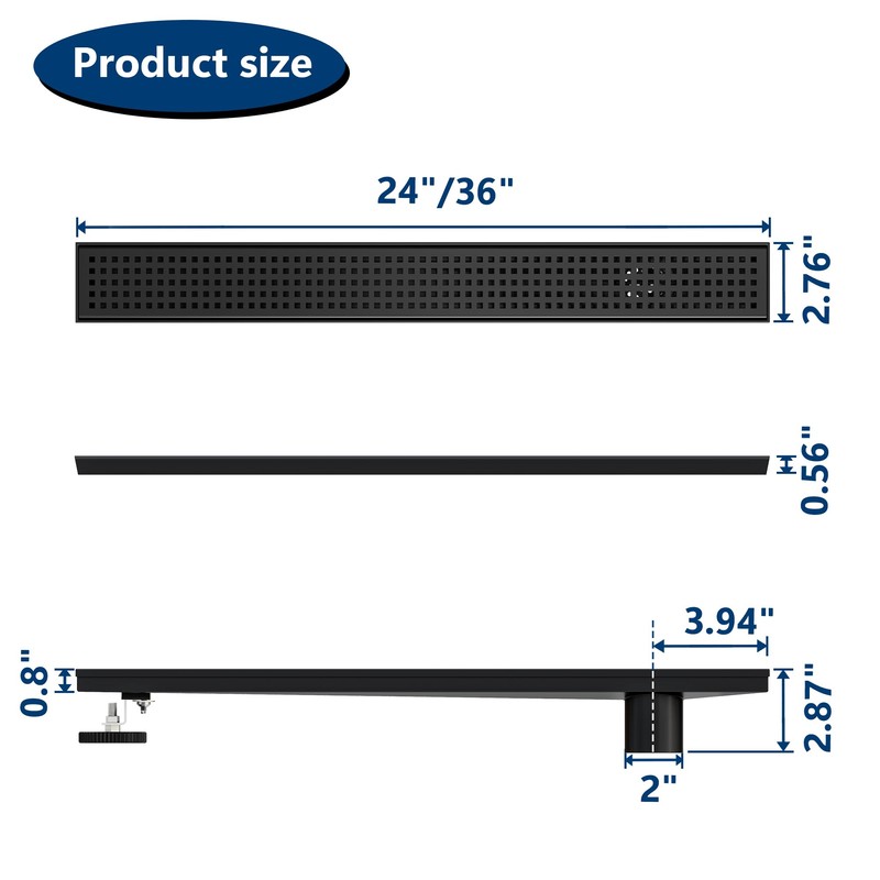 - √ Linear Shower Drain Size:24" length, 2.75" width, 2" Side outlet. 36 L/min High Flow Capability.