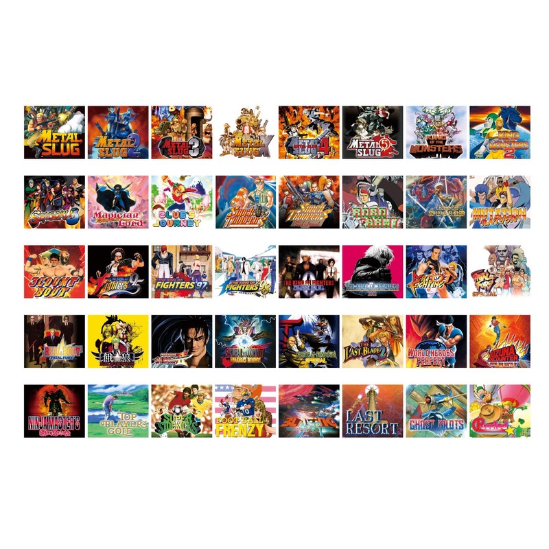 Metal Slug X/2. Metal Slug 4/3. Metal Slug 5/4. King of the Monsters/5. Shocktroopers/6. Magician Road/7. Lagy/8. Robotarmy/9. Cross Sword/10. Mutation Nation/11. Fire Superlex/12. Last Resort/13. Ghost Pilot/14. Football Frensie/ 15. THE KING OF FIGHTERS '95/16. THE KING OF FIGHTERS '97/17. THE KING OF FIGHTERS '98/18. THE KING OF FIGHTERS 2000/19. THE KING OF FIGHTERS 2002/20. Shin Samurai Spirits Hail Kai / 21. Samurai Spirit. Ts Advent /22. Samurai Spirits Zero Special/23. Legends of the Wolf Special / 24. Real Baud Legend/25. Hiru Mark of the WOLVES/26. World Heroes Perfect / 27. Fenguen Super Tag Battle / 28. The Fist of the Dragon Tiger, 29. The Battle of the Battle of the Battle of the Moon Gorgeous, scattered Hana~/30. NINJA MASTER'S ~ Hakao Ninja Book ~ 31. Metal Slug, 32. Metal Slug, 2/33. Metal Slug 3/34. King of the Monsters 2/35. Sengoku Languard 2001/36. Shock Troopers Second Scud, 37. Blazing Star, 38. /39. Dot-King 40. Joy Joy Kid
