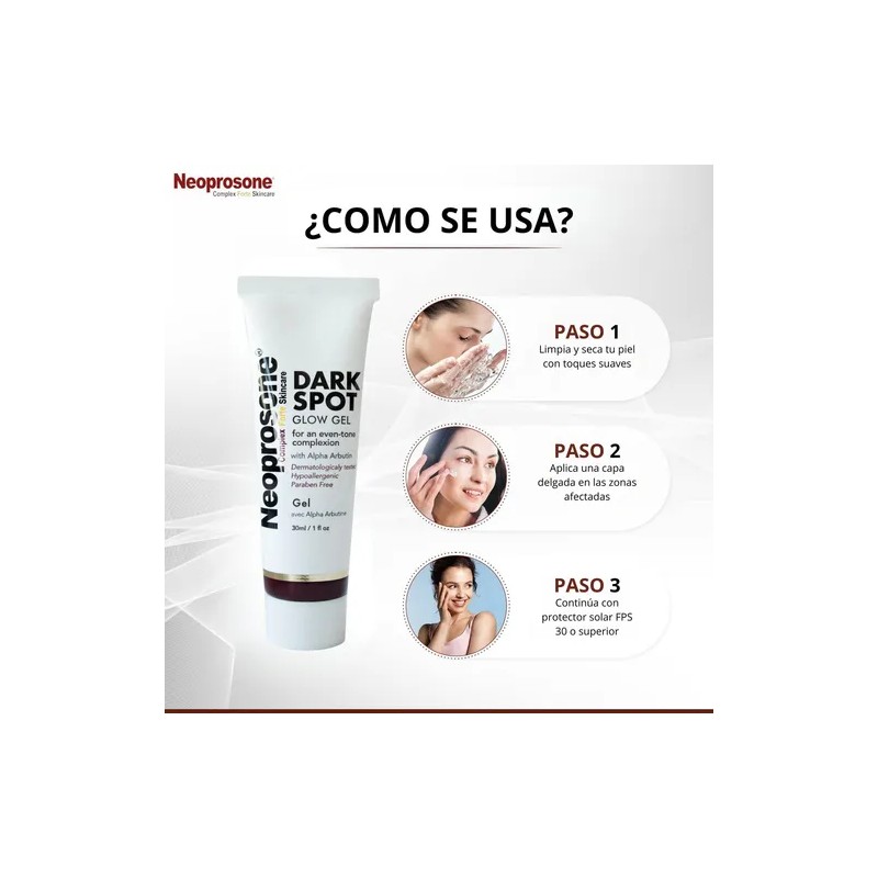 Este gel para manchas oscuras de Neoprosone se aplica en las áreas afectadas de la piel donde se presentan manchas oscuras. Está diseñado para una aplicación localizada en zonas con hiperpigmentación o tono de piel desigual.