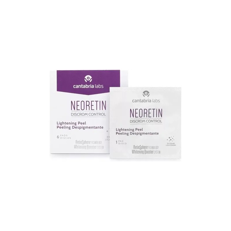 El Neoretin Discrom Control Despigmentante (6ml + Almohadillas 1ml) es un tratamiento intensivo para combatir manchas oscuras y mejorar la piel, utilizando un serum/gel y almohadillas con Tecnología RetinSphere® y Whitening Booster System. Se aplica preferiblemente por la noche, usando primero la almohadilla y luego el serum/gel. Es esencial usar protector solar diario. Si hay irritación severa o si estás embarazada/lactando, consulta a un dermatólogo.