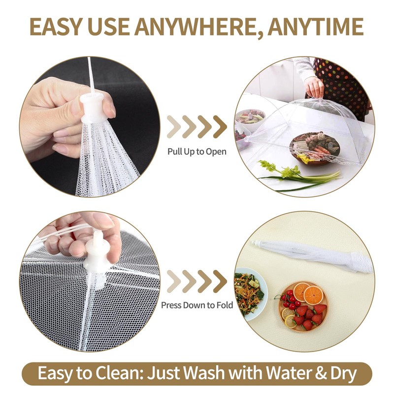 - Year-Round Use and Easy Storage: Easy to open and collapses like an umbrella for slender storage. Simple to clean - just wipe, rinse, and air dry. Occupies minimal space in RVs, drawers, or shelves. Useful throughout the year for camping, patio dining, family cookouts, or picnics. Cover bowls of popcorn during outdoor movie nights or tailgating, or while prepping meals. Ideal for bistro restaurants or summer catering, they elevate the typical dining spread