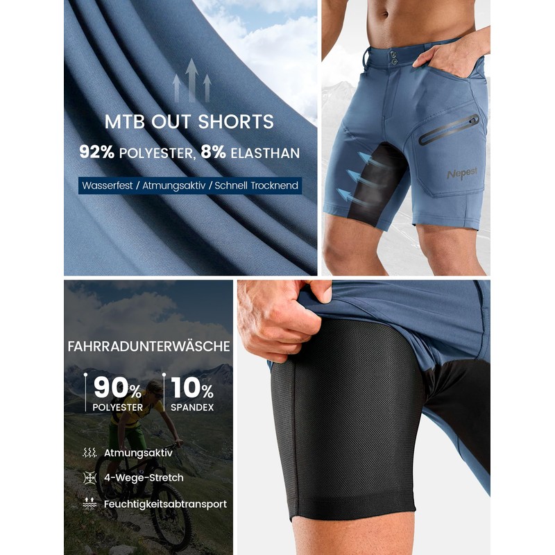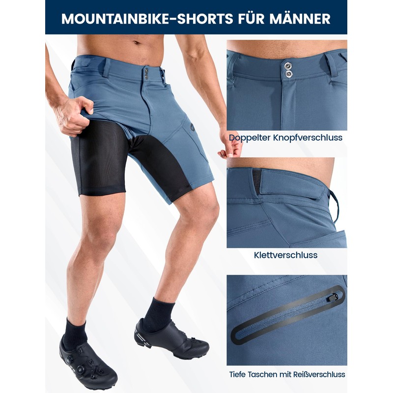 Nepest Mountain Bike Shorts Men's Short MTB Shorts Padded 3D Cycling Shorts Loose with Zip Pocket Bike Shorts Breathable, Dusty blue, L