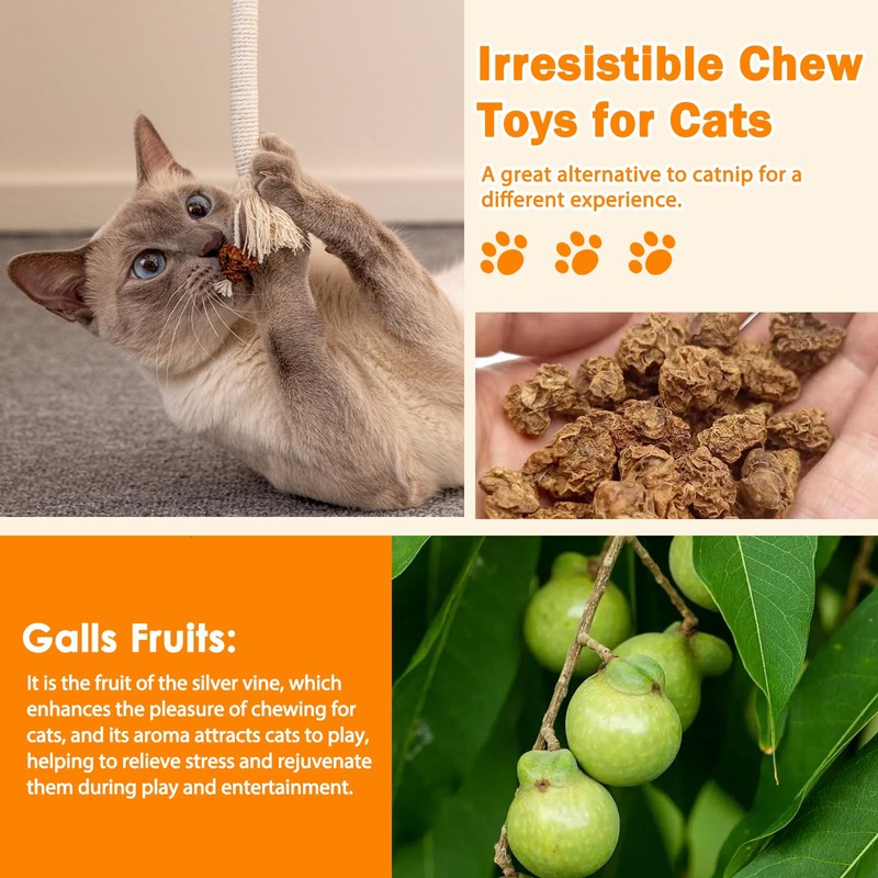 - INTERACTIVE CAT TOY: Chewing rope toys come in a variety of bright colours and tassel designs, plus the constant swaying of the gall fruit hanging from the end of the rope will ignite your cat's curiosity and natural hunting instincts, cat rope toys allow your cat to enjoy the fun of natural instincts, say goodbye to home damages and night noises.