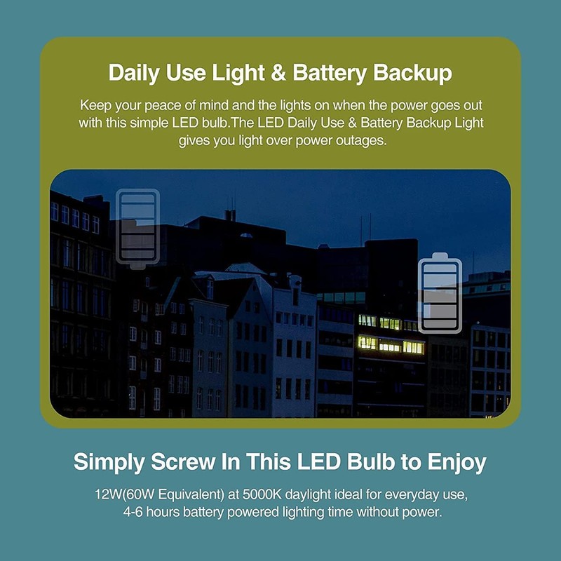 • 【Easy to Use & High applicability】60 watt equivalent + 5000K Daylight is most popular choice for home daily use. A19 size bulb has higher applicability for most lamp with E26 or E27 socket. Just screw them into the socket and done! (Other emergency light bulbs on the market are often large in size that may can't fit in your light fixture. This one like the normal type A bulb, perfect for any light fixtures , like floor lamp, desk lamp, table lamp, ceiling light ect)