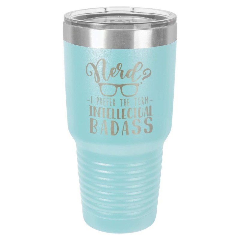 - PREMIUM QUALITY ENGRAVED TUMBLER: This 30 oz Nerd I Prefer The Term Intellectual Badass Engraved Tumbler has a colored powder coating and our laser engraver removes this powder coating, exposing the high quality stainless steel and comes with a clear lid. THIS IS NOT A DECAL! Ideal for hot & cold beverages. A great gift for birthdays, Christmas, family occasions, vacations, beach, pool or travel.