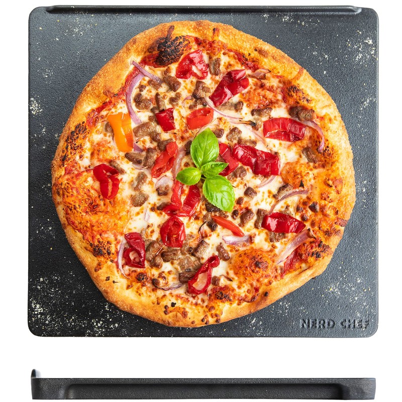 NerdChef Speed Steel - High Performance Pizza Baking Stone | Integrated Backstop & Handles | Heating Fins (13.5" x 14.5" x .90" Thick)