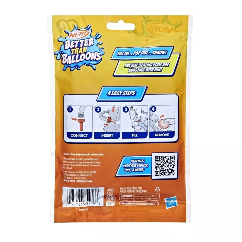 Nerf Better Than Balloons brand is the water balloon alternative for a revolution in water play! There are so many ways to play with these colorful water pods! Pop them, stomp them, throw them, and splash them! Make up all kinds of games with these versatile water pods that are fun for everyone. Nerf Better Than Balloons self-sealing pods stay in 1 piece when they burst, so when the play is over, picking them up is quick and easy. No more searching for lots of small pieces, which makes cleaning up after water balloon games such a chore. The water pods come attached together on a sheet and are easy to remove. The individual sheets let you choose how many you want to use. Fill a few sheets to enjoy multiple games or fill them all for one big burst of fun! The design and material make them reliable when filling up, for less unintended breakage. Includes a total of 36 pods on 3 sheets and a reusable nozzle.