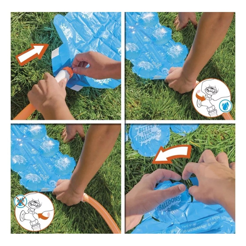 - FILL, REMOVE, AND PLAY: The pods come attached on a sheet. Lay the sheet flat, fill it with water from a garden hose, remove the pods, and start playing! Includes a reusable nozzle to attach to the garden hose