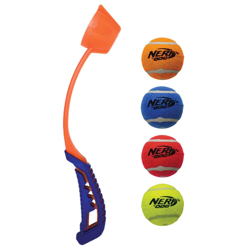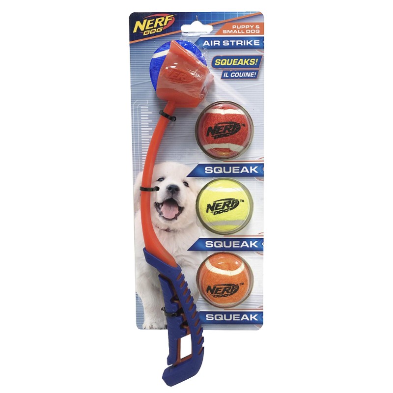 Nerf Dog 5-Piece Dog Toy Gift Set, Includes 13in Air Strike Launcher and 2in Squeak Tennis Ball 4-Pack, Nerf Tough Material, Multicolored