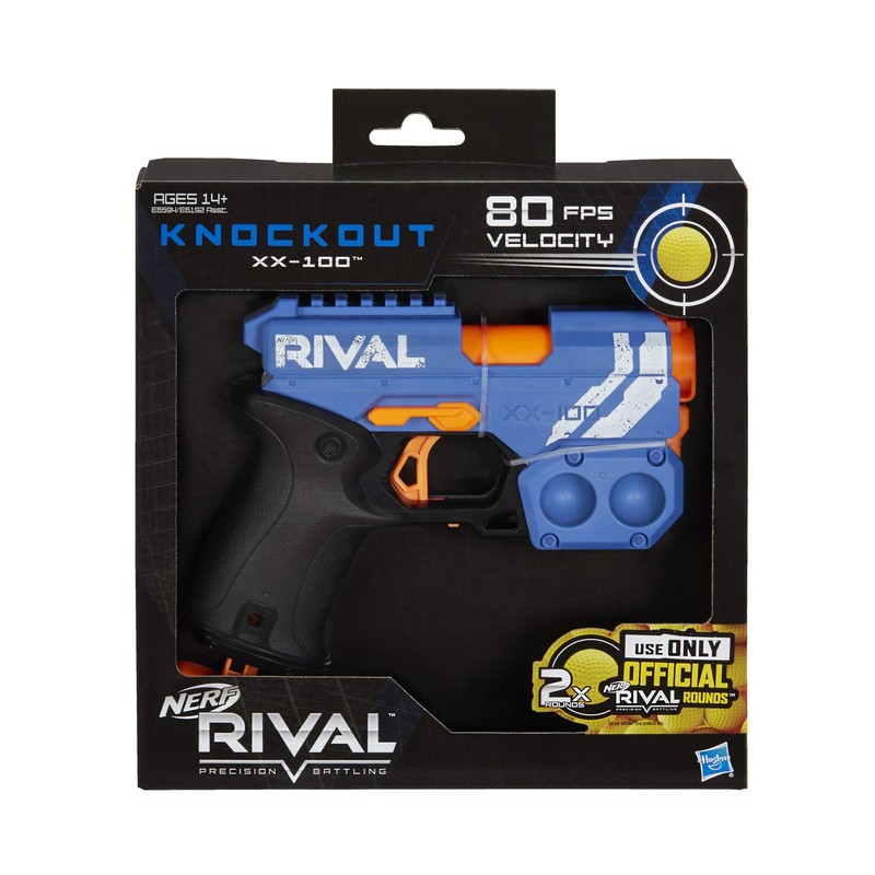 Blast into Nerf rival competitions with this compact powerhouse to knock out the competition! The knockout xx-100 blaster packs high-intensity Nerf rival power in a small size. Fire off rounds at 90 feet per second from this spring- action, single-shot blaster that's great for games that move fast and keep you on the run. Playing in a small area? The breech-load knockout xx-100 is ideal for close spaces and stealth attacks. It has built-in round storage and comes with 2 official Nerf rival rounds. Trigger lock prevents it from firing accidently. Load 1 round, Prime, and pull the trigger to fire. Team blue version. Hand-powered (no batteries required). eyewear recommended (not included). nerf and all related properties are trademarks of Hasbro.