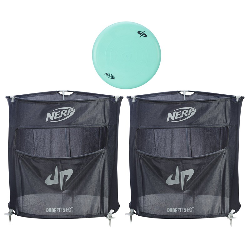 Make a Nerf Perfect play with the Dude Perfect PerfectSlam Disc Game from Nerf Sports! Toss or slam the flying disc into the can to score points! The game comes with 2 soft cans and a disc. Get together with friends to play a game or try challenging shots. Play as teams with one person tossing the disc and the other person trying to slam the disc into the can. Get the disc through the slot for a big win. The instructions include game starters and trick shot ideas. Go big with the PerfectSlam Disc Game, which combines the adrenaline rush of Nerf Sports with the exhilarating fun of Dude Perfect! Copyright Dude Perfect, LLC. Dude Perfect and the stylized DP logo are trademarks of Dude Perfect, LLC. Nerf and all related properties are trademarks of Hasbro.