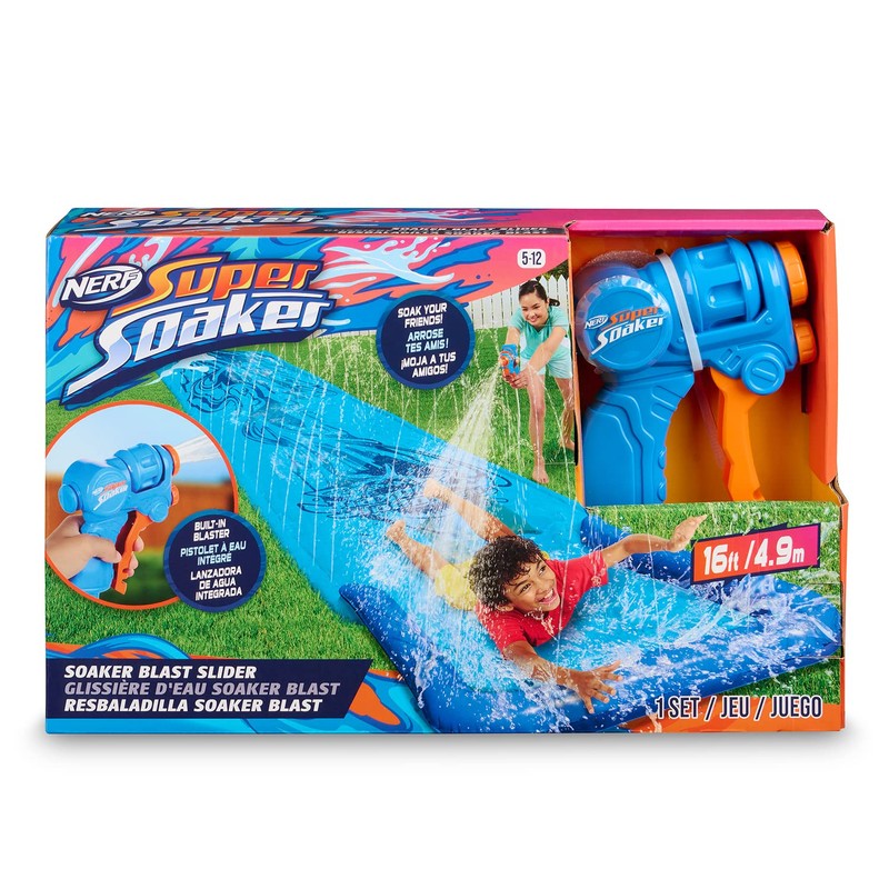 - UNLEASH THE ULTIMATE SOAK! Slide and get soaked with this interactive, 16 ft water slide! Kids ages 5-12 can take turns sliding on the Soaker Blast Slider or soaking their friends with the built-in water blaster.