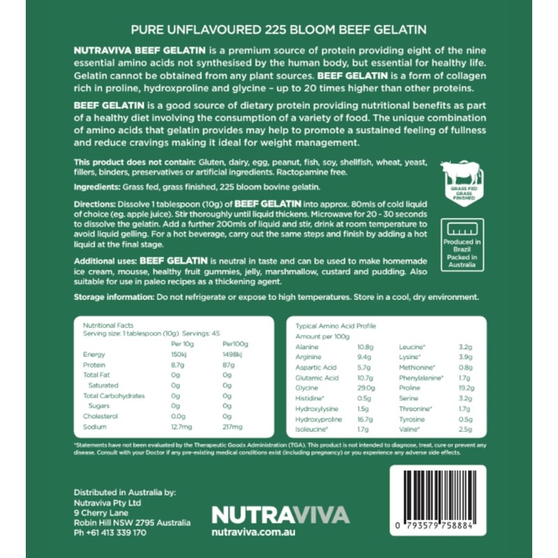 Grass Fed Beef Gelatin has been used since our early ancestors, where they boiled bones to extract the gelatin and nutrients to use as a source of nourishment and to improve health and wellbeing. NesProteins Gelatin is a natural product that assists in improving a wide range of health benefits and is particularly good for gut issues, weight management and reducing inflammation. Available in 450 g pack.