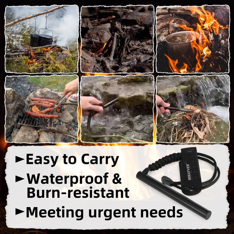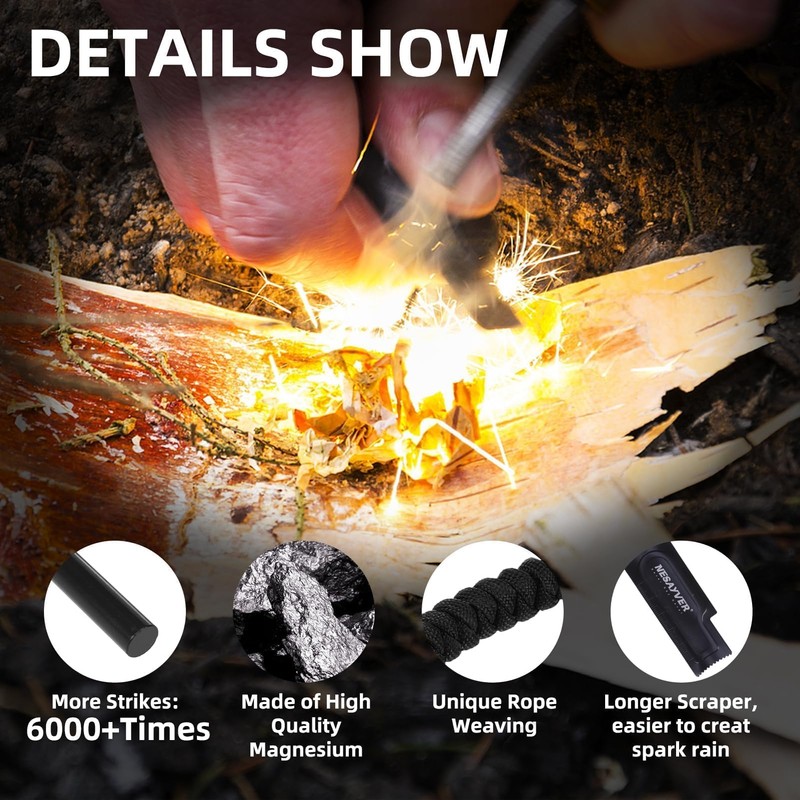 - EFFECIENT IGNITION STSTEM: We are also equipped with a pocket bellow and ignition ropes, making it faster and easier to start the fire. Prepare combustibles, scrape the protective layer on the surface of the ferro rod, use the metal scraper to scrape the magnesium rod, scrape off magnesium debris onto the combustibles, use a scraper or tool to vigorously scrape the magnesium rod at a 45 degree angle towards the combustibles, ignite the magnesium debris and combustibles