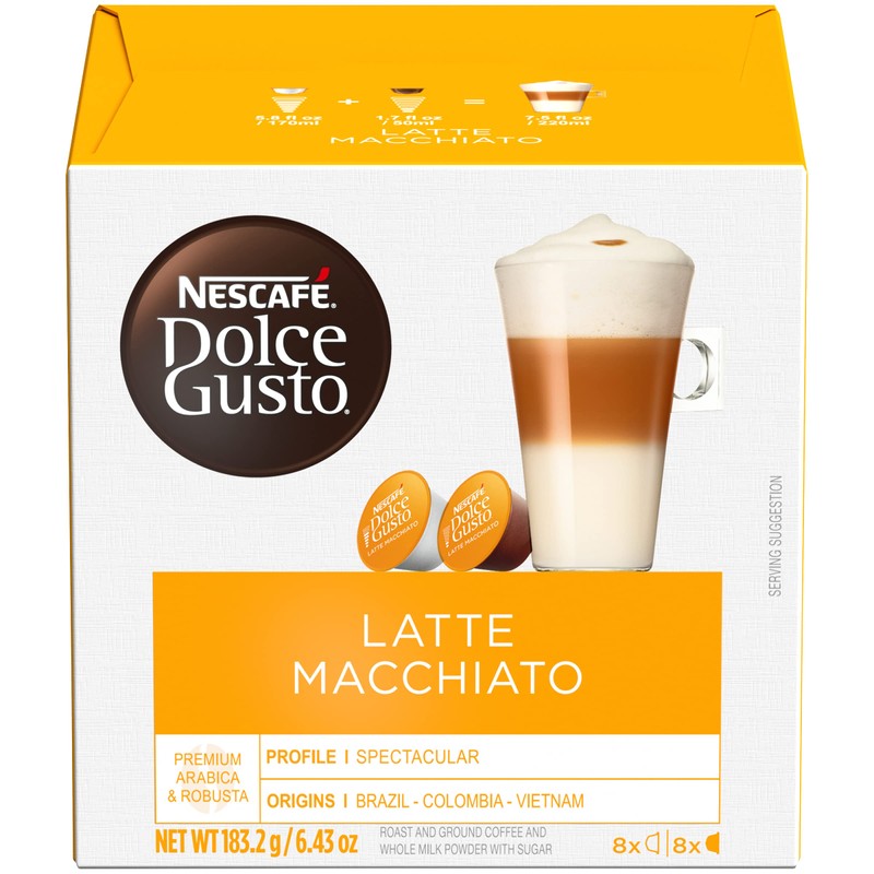 Discover Nescafe Dolce Gusto Latte Macchiato - Milkier than Cappuccino, this layered icon is a unique blend of hot frothed milk, smooth espresso and indulgent milk froth topping.Our expert coffee creators have perfected the Nescafe Dolce Gusto Latte Macchiato two capsule recipe: one capsule for the espresso, a special blend of both smooth and fruity premium coffee beans, and one capsule for the frothy whole milk with a touch of sweetness.Product is to be used exclusively with Nescafe Dolce Gusto machines. The hermetically sealed capsules make for a rich and aromatic cup every time. Stimulate your senses with our exciting coffee solutions. Our machines look stunning in any professional space and consistently craft great-tasting hot and cold specialty coffees in rich, deep flavors with enticing aromas. Tantalize your taste buds with the latest coffee breakthrough from Nescafe. Discover Nescafe Dolce Gusto and rediscover coffee.