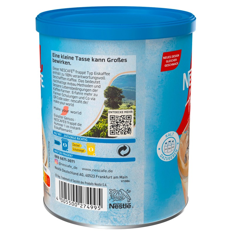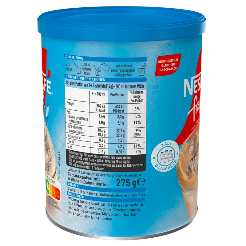 - Lieferumfang: 1x275g Frappé Typ Iced-Coffee Dose, Iced Coffee-Pulver mit löslichem Bohnenkaffee von NESCAFÉ für 19 Portionen