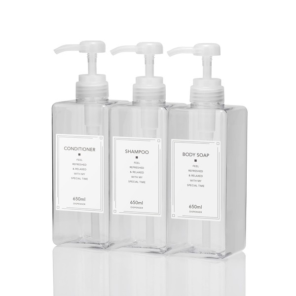 NESEKT Shampoo Bottle, Dispenser, Refill Bottle, 3 Types, 22.0 fl oz (650 ml) (Clear 3 Pieces)
