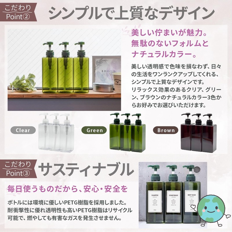 Nesekt Shampoo Bottle, Dispenser, Refill Bottle, 3 Types, 22.0 fl oz (650 ml) (Green 3 Bottles)