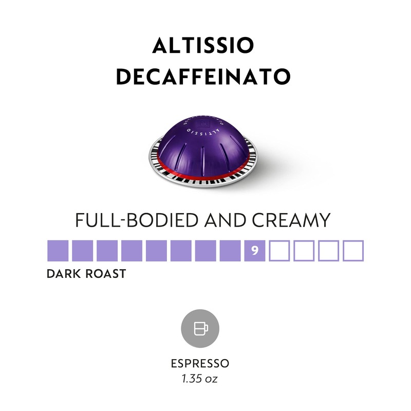 - ALTISSIO DECAFFEINATO ESPRESSO BREWS 1.35 OZ: These Nespresso VertuoLine pods are part of the Espresso range that will provide you with a 1.35oz serving of a traditional espresso coffee beverage