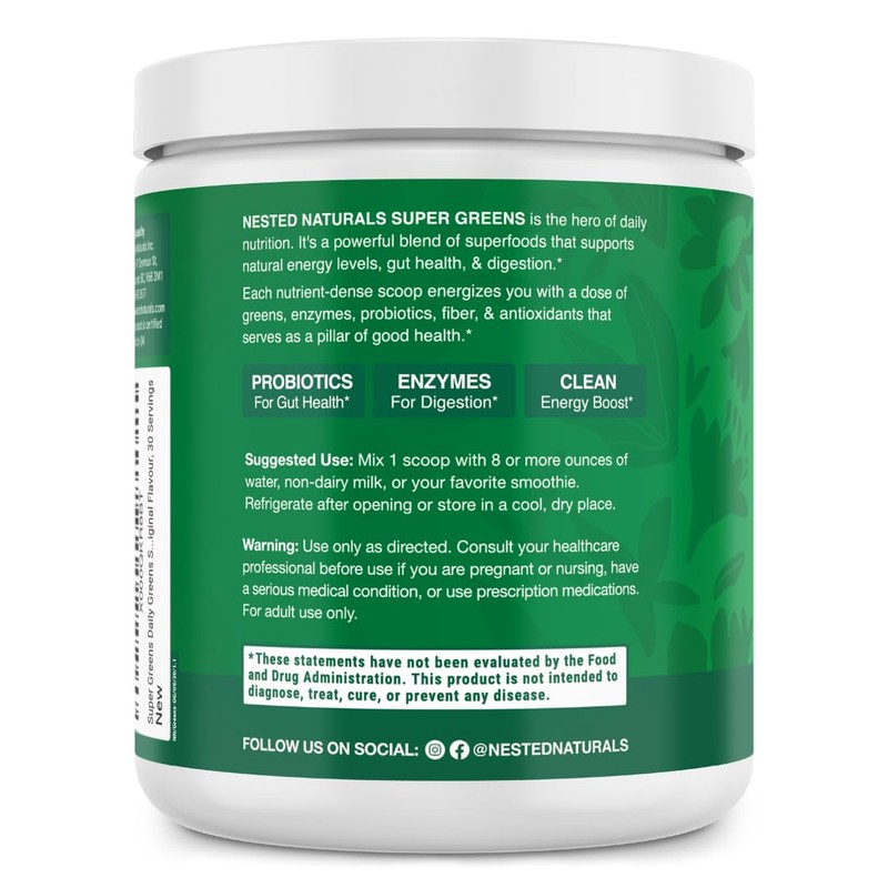 Nested Naturals Super Greens Daily Superfood Powder - Certified USDA Organic Green Powder w/20+ Whole Foods, Spirulina Powder,Wheat & Barley Grass - Probiotics, Fiber & Enzymes - Original Flavour, 30