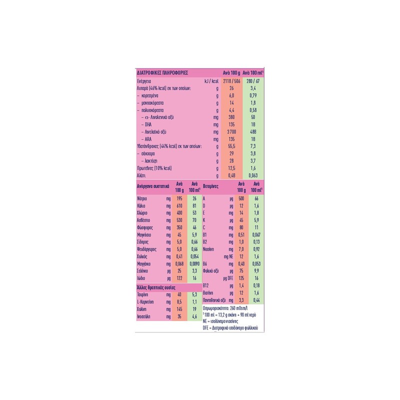 It is a nutritionally complete food and is suitable for exclusive nutrition of infants up to 6 months old. Contains long chain fatty acids, vitamins-minerals-trace elements, as well as pure lactose for improved taste.