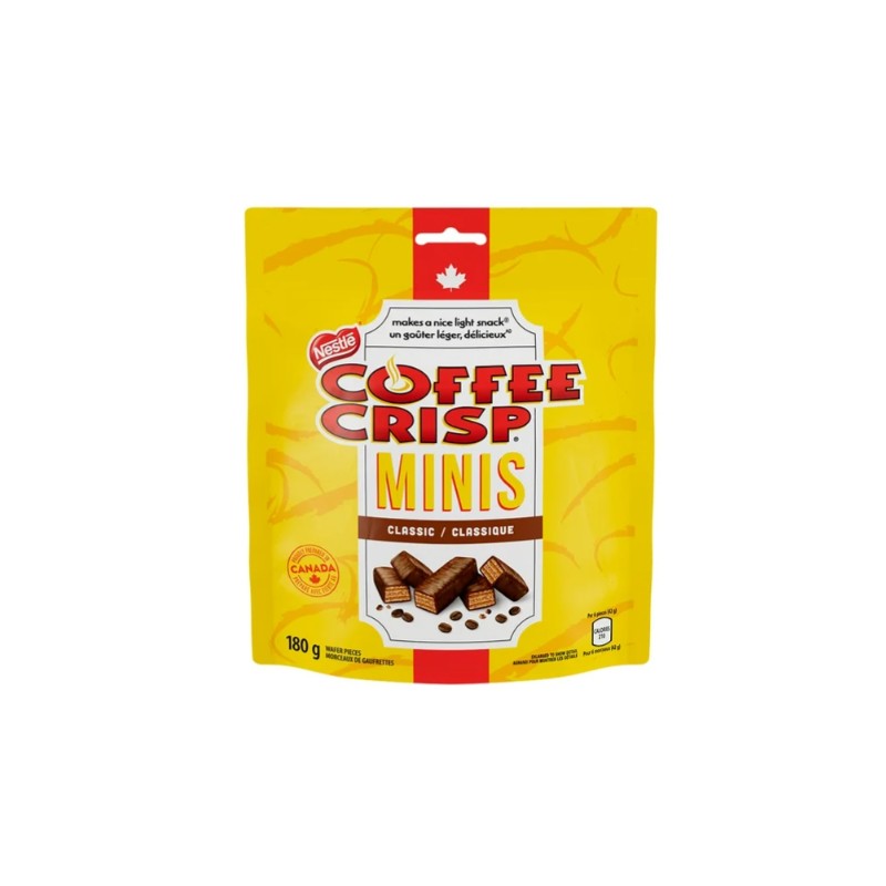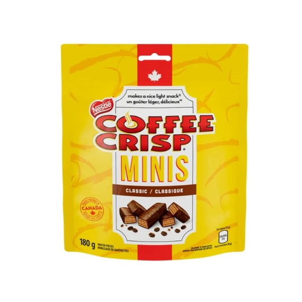 Write a Product description for the item in full sentences: "Coffee Crisp Minis Wafer Bars Pouch is a convenient and delicious treat that combines crispy wafers with a rich coffee-flavored coating, all in a handy 180g pouch.