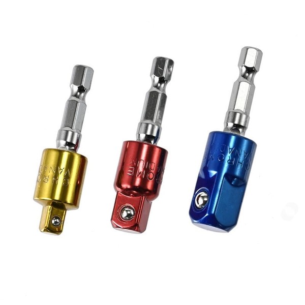 - Includes 3 adapters: 1/4" hex shank to 1/4" socket, 1/4" hex shank to 3/8" socket, and 1/4" hex shank to 1/2" socket.
