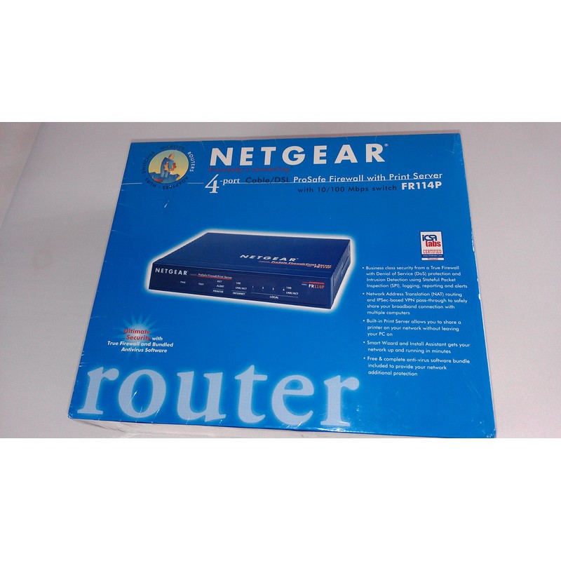The Netgear 4-Port FR114P ProSafe Router / Firewall makes inexpensive, secure Internet connection sharing a reality. The FR114P realizes these ideals via true firewall, intrusion detection, switching, routing & 11Mbps wireless functionality. The unit also shares one printer with many PCs via integrated print server. Includes Freedom antivirus & privacy protection software from Zero Knowledge Systems Includes Power Adapter, Cat 5 cable & resource CD 3 Year Warranty