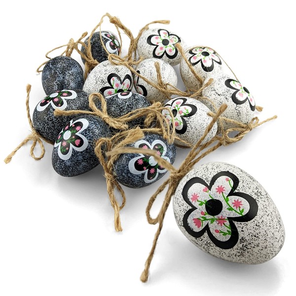 - Box contents: 12 Easter eggs size: 4 cm; made of high quality plastic with jute string; colours: white and black with flower, speckled. The eggs are hollow inside. Due to differences in monitor settings, the colour of the product may not be reproduced authentically.