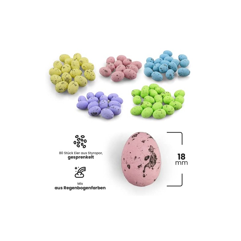 - ⦁ TECHNICAL DATA - 80 pieces of multicoloured speckled polystyrene Easter eggs 1,5x1,8cm (0,59x0,71inch) on a paper plate with green paper strips.