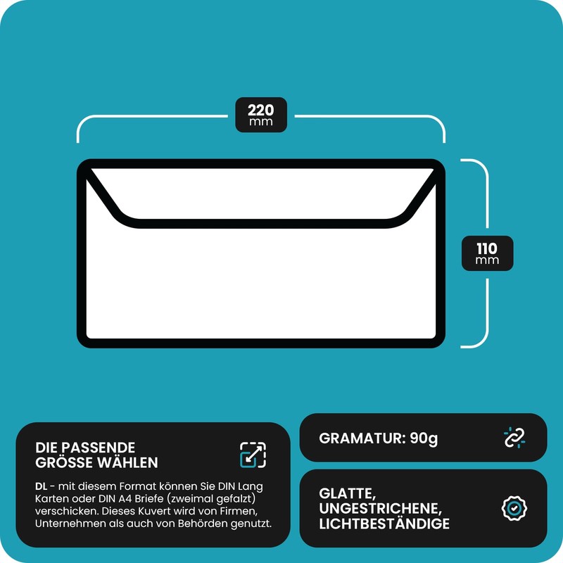 • Choose the right size – depending on whether you need the envelopes for sending cards, letters or flyers, you need to find the right envelope size. DL (110 x 220 mm) - with this format you can send DIN long cards or DIN A4 letters (folded twice). This envelope is used by companies, companies as well as authorities.