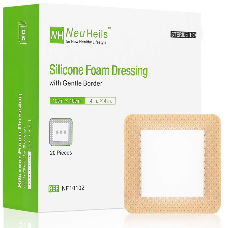 NeuHeils Silicone Foam Dressing with Gentle Border 4''x4'', 20 Pack for Bed Sore Leg Ulcer, High Absorbency Large Waterproof Silicone Wound Bandage