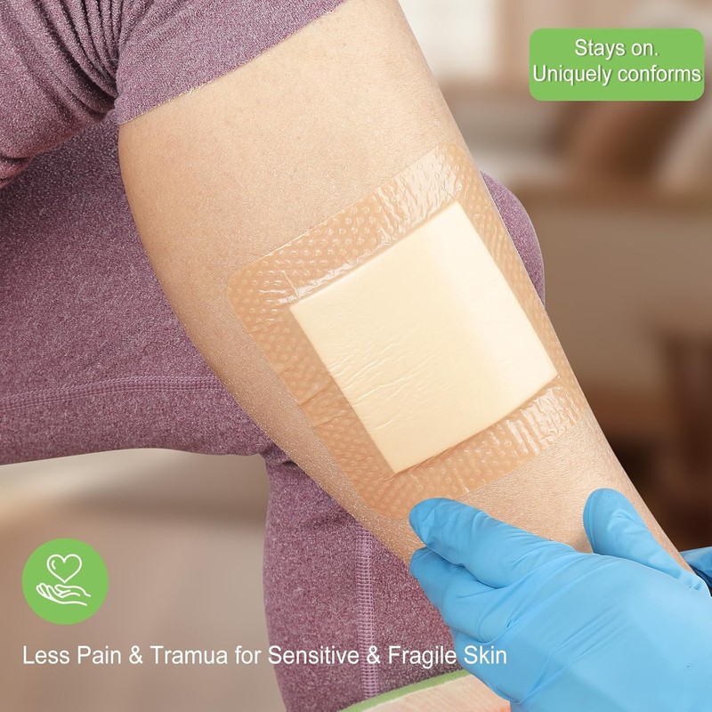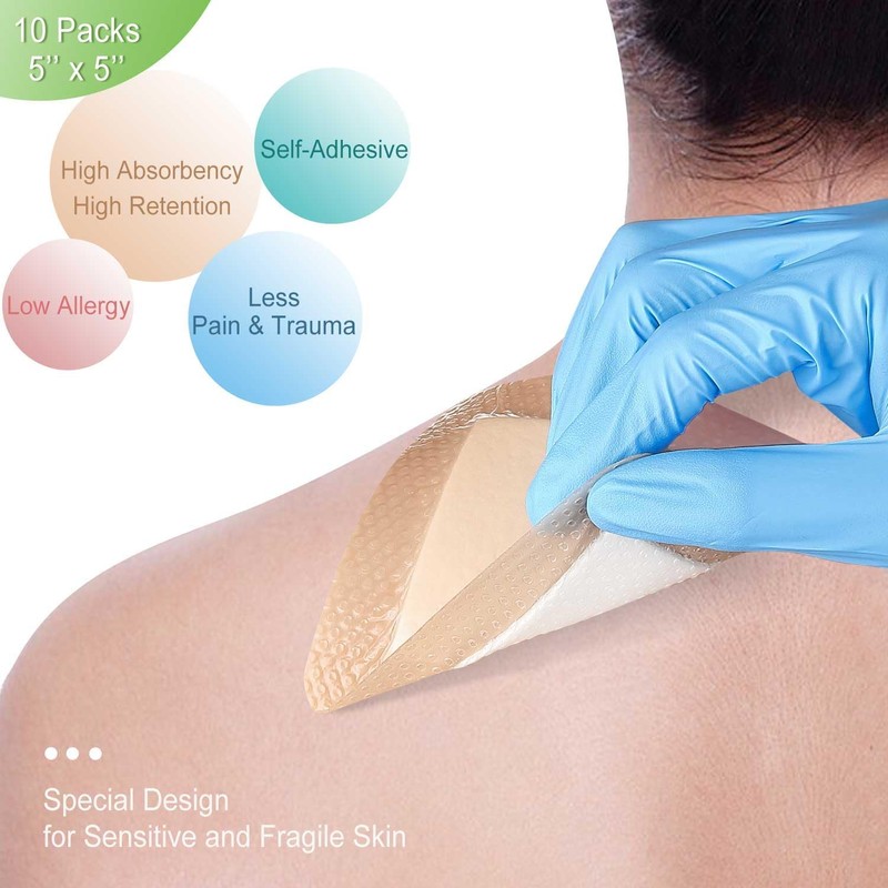 • Gentle Silicone Adhesive Technology – Securely adheres to skin without extra tape or bandages, minimizing trauma & pain during dressing changes. Repositionable for sensitive or fragile skin. Dressing size 5 in. x 5 in., absorbent pad size 3in. x 3in., indivial package, 10 packs each box.