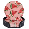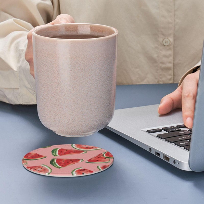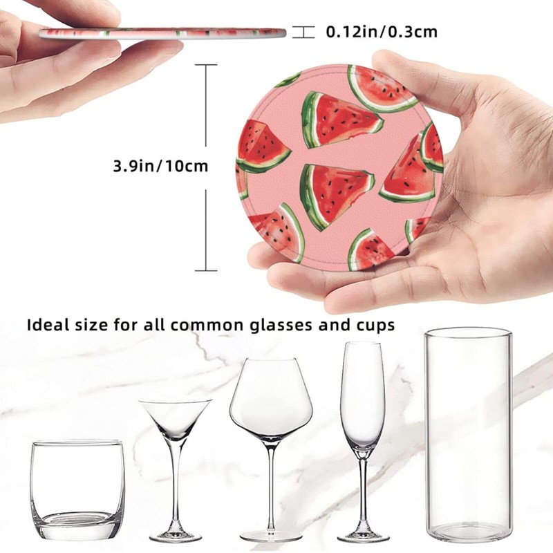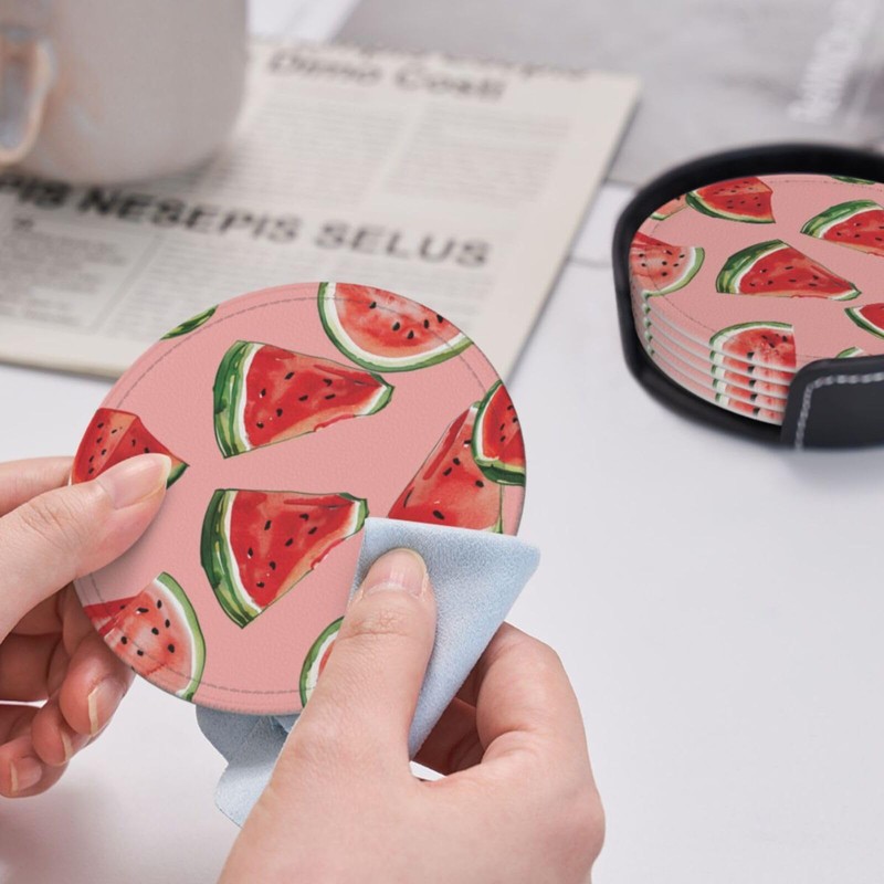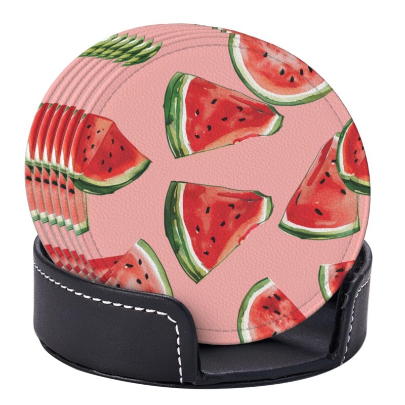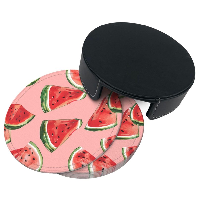 Neukim 6 Pcs Red Watermelon Leather Coasters with Holder - Round Mug Mat Set for Living Room & Kitchen