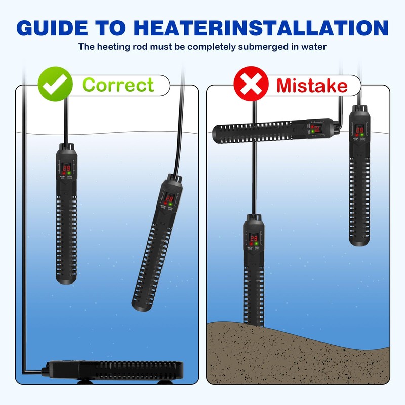 - 【Fish-friendly Aquarium Heater】The submersible aquarium heater is made of explosion-proof quartz glass material and high-temperature resistant nickel-chromium heating wire. With sturdy shell for protection, making stably generate heat and fast dissipation to prevent accidental collision and explosion of the heating rod and protect the fish from scalding.
