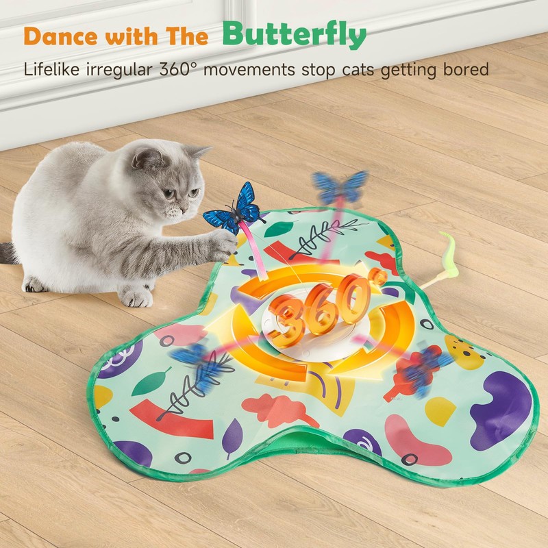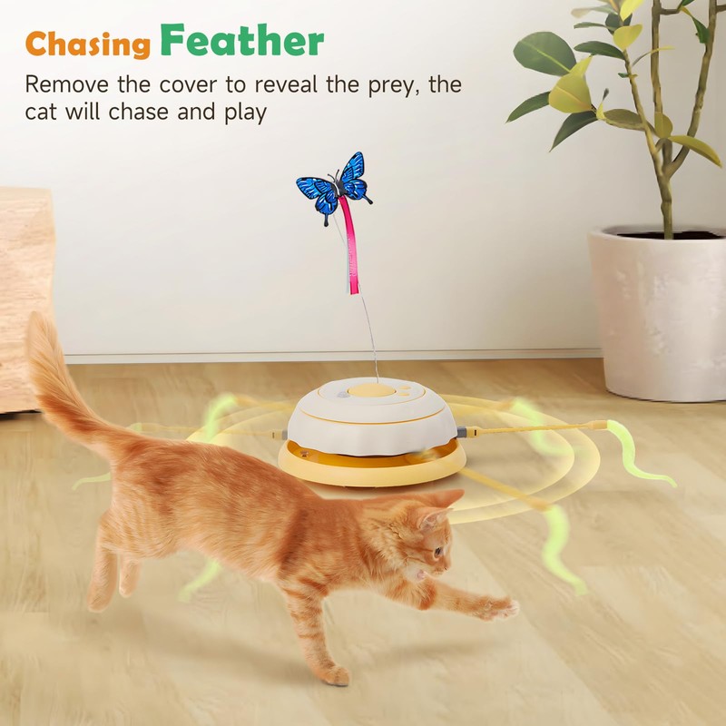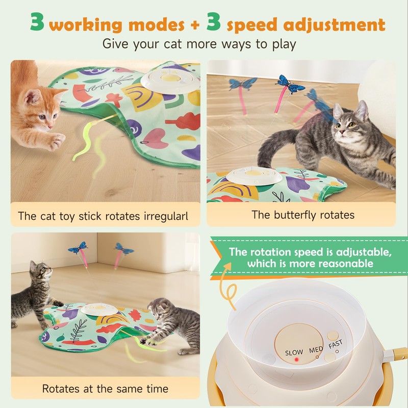 - 【Multi Modes for Indoor Fun】This interactive cat feather toy features a range of captivating movement modes that stimulate cat's natural instincts to chase, pounce, and play. It can perform the actions of chasing feather and spinning butterlfy simultaneously or separately; The diverse play options ensure your cat gets the mental and physical stimulation and enough exercise to eliminate boredom.