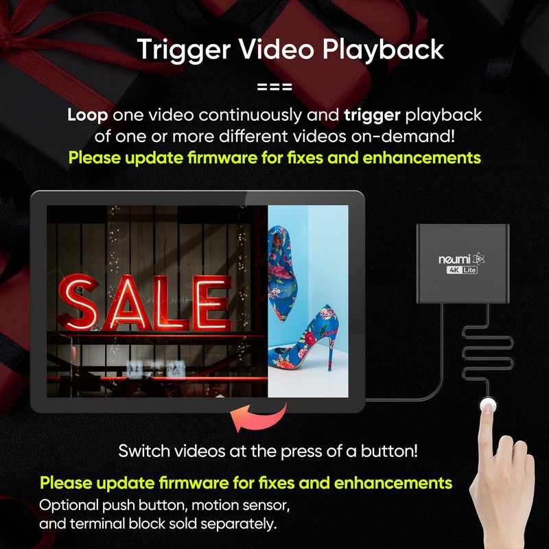 - 【TRIGGER SENSOR INPUT】- Ability to loop one video continuously and play a different video when triggered by an optional push-button or motion sensor. Build an interactive digital signage display, art gallery or museum on-demand video player, or a Halloween special effect in just a few steps. Push-button and motion sensors sold separately.
