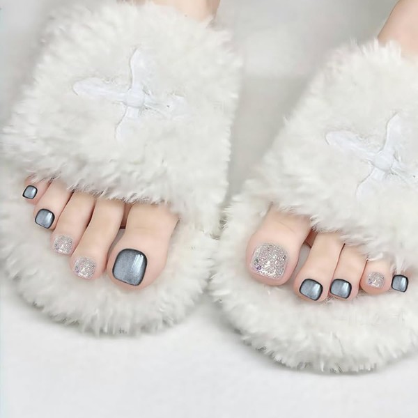 [NEURAD]ネイルチップ 足用 黒 24枚入 フットネイル フットネイルチップ 足用ネイルチップ マグネット 夏 付け爪 猫目石 可愛い 人気 シンプル